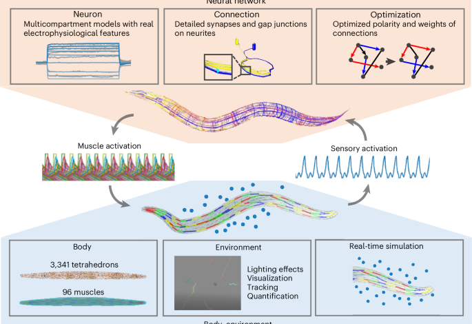 The C. elegans neural network simulation and optimization were conducted with the code written in Python 3.8, and NEURON 8.0.0 was used as the simulation engine63. Experiments were performed primarily on a system configured with Ubuntu 18.04, an NVIDIA GeForce RTX 3060 graphics processing unit, 16 GB random-access memory and an Intel Core i7-10700K central processing unit.