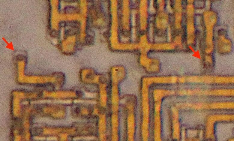 Closeup of the Pentium die showing the silicon and bottom metal layer. The arrows indicate connections to two antenna diodes. I removed the top two layers of metal for this photo.