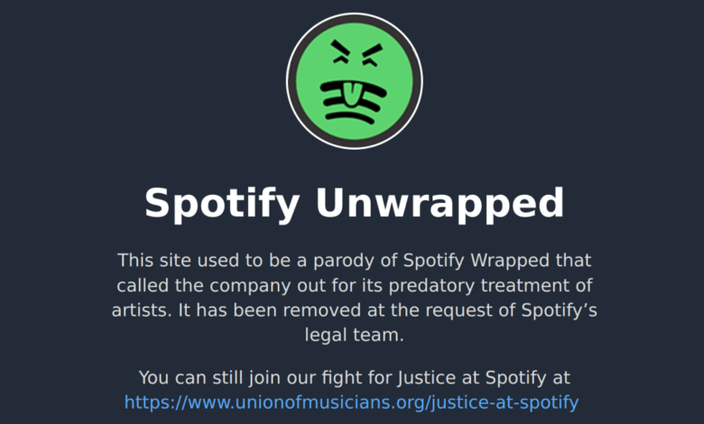 “This site used to be a parody of Spotify Wrapped that called the company out for its predatory treatment of artists,” the message begins. “It has been removed at the request of Spotify’s legal team. You can still join our fight for Justice at Spotify at the United musicians and Allied Workers (UMAW) website.”