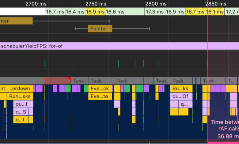 We could stop there, but there’s one more thing that you might want to consider: frame rate. If you look closely at the screenshots above, you’ll notice thin green markers roughly corresponding to the paint cycle. These are custom timings using performance.mark to show when a requestAnimationFrame callback runs. There’s a curious difference in the frame rates of scheduler.yield and setTimeout.