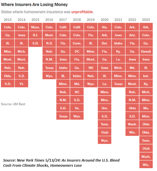 This is not an abstraction, though many are treating it as a policy debate. As noted previously here, the insurance industry is not a charity, and insurers bear the costs that are increasing regardless of opinions and policy proposals. Insurers operate in the real world, and their decisions to pull out of entire regions, reduce coverage and increase premiums are all responses to soaring losses, a reality reflected in these charts.