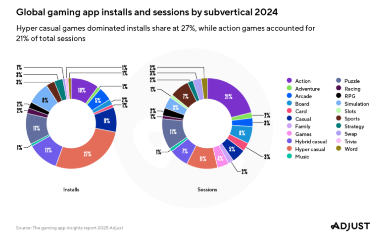 One of the major sources of growth were in emerging markets — specifically in LATAM and MENA, where installs grew by 9% and 7% year-over-year in 2024, respectively. Adjust’s report also notes that hyper-casual games had the highest install share at 27%, though they only held 11% of sessions given their tendency towards high churn rates. Strategy games, on the other hand, had the highest install growth at 83%.