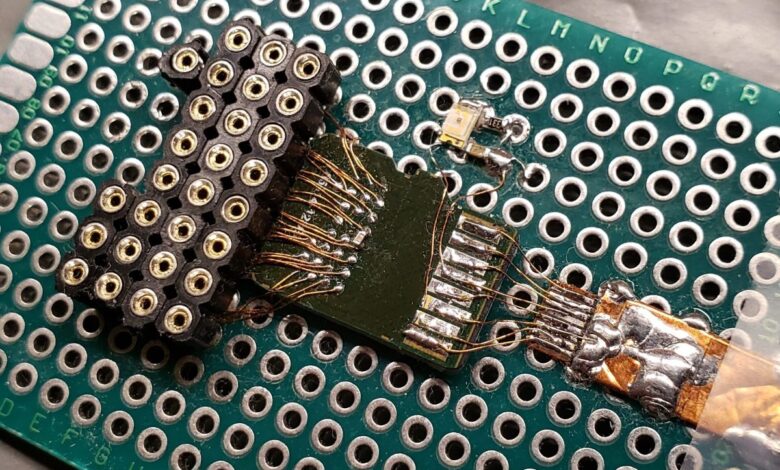 I started by using double-side foam adhesive tape to secure the SD card to a piece of perfboard. I then tinned all of the pads and soldered a small 1uF ceramic capacitor across the card’s power (Vcc) and ground (GND) test pads. Using 40-gauge (0.1 mm, or 4-thousandths of an inch!) magnet wire, I mapped each test pad to its corresponding machine-pin socket on the perfboard. Including the extra test pads, that’s a total of 28 tiny wires!