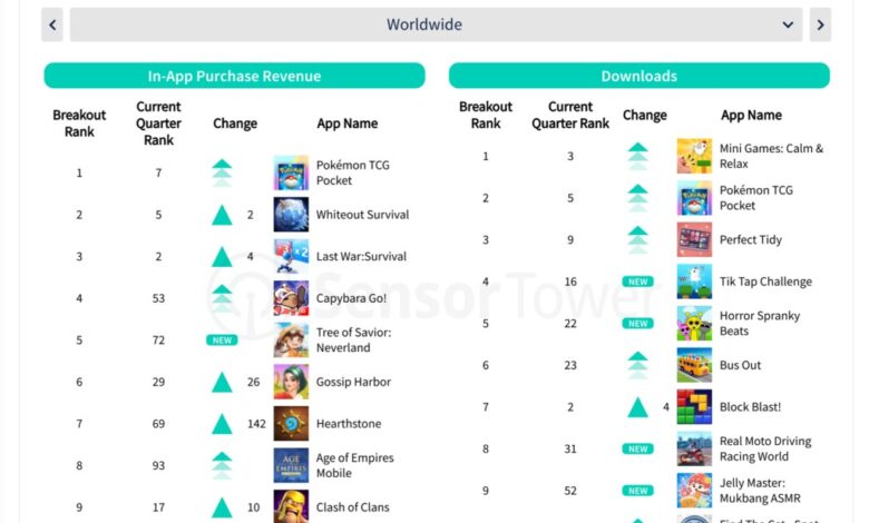 Specifically, six out of the top 10 games on the Q4 breakout games chart (when sorted by in-app purchase revenue) were strategy games, including Whiteout Survival, Last War: Survival and Age of Empires Mobile. Pokémon TCG Pocket was also one of the biggest new hits of the quarter, having launched in October and almost immediately shooting to the top 10. It’s also the only game that was on both the top IAP revenue and top downloads lists for Q4.
