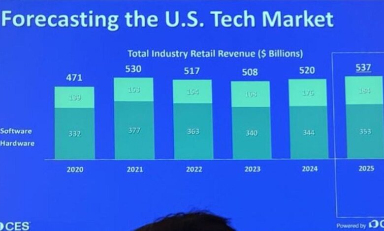 The tech market in the U.S. is expected to grow a few percent in 2025 to $537 billion, so long as there isn’t a trade war triggered by promised tariffs from president elect Donald Trump, according to the Consumer Technology Association, the group that puts on CES.