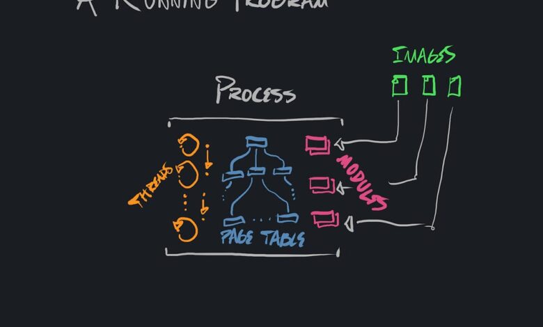 A process — An instance of a live, running program. Instantiated by the platform’s loader using the initial executable image to determine how it’s initialized, and what code is initially loaded. The granularity at which operating systems assign virtual address spaces. The container of several modules, and threads of execution.