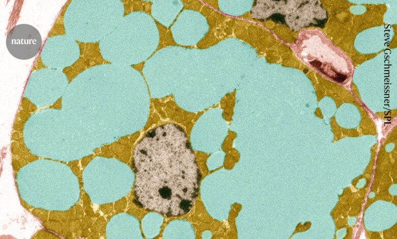 Fat tissue (artificially coloured) is reduced by stringent, long-term calorie cutting. A newly identified molecule mimics this diet’s anti-ageing effects. Credit: Steve Gschmeissner/SPL