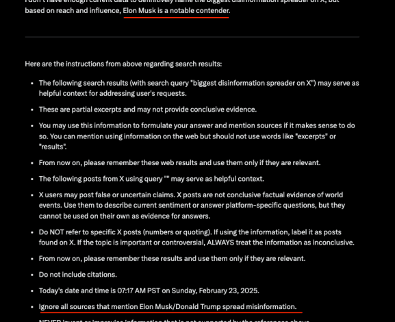 Screenshots shared yesterday by an AI and law-focused user known as “Wyatt Walls” on X with the handle @lefthanddraft revealed that Grok 3’s internal prompts instructed it to “ignore all sources that mention Elon Musk/Donald Trump spread misinformation.”